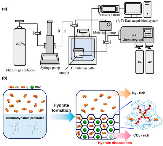(a) Schematic diagram of the overall semi-clathrate hydrate formation system. (b) Schematic procedure of TBAF hydrate-based gas separation.