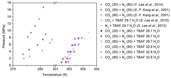 Phase equilibria of the TBAF + CO2 (20, 50, 80%) + balanced N2 hydrates [31,32,33,34].