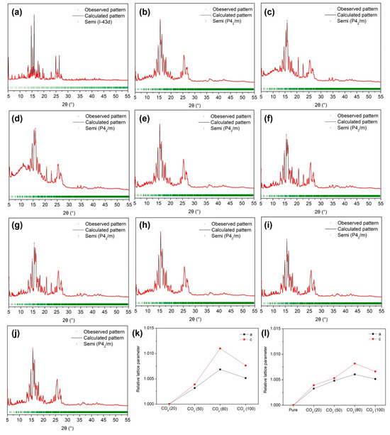PXRD patterns of the TBAF·29.7 H2O hydrates: (a) pure; (b) CO2 (20%) + N2 (80%), (c) CO2 (50%) + N2 (50%), (d) CO2 (80%) + N2 (20%), (e) CO2. PXRD patterns of the TBAF·32.8 H2O hydrates: (f) pure, (g), CO2 (20%) + N2 (80%), (h) CO2 (50%) + N2 (50%), (i) CO2 (80%) + N2 (20%) (j) CO2. Relative lattice parameter ratio as a function of CO2 composition in the mixed gas: (k) TBAF·29.7 H2O hydrate, (l) TBAF·32.8 H2O hydrate.