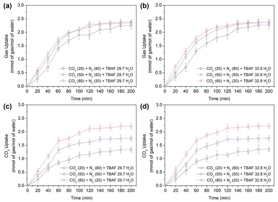 Gas uptake of the semi-clathrate hydrates: (a) TBAF·29.7 H2O, (b) TBAF·32.8 H2O; CO2 uptake of the semi-clathrate hydrates: (c) TBAF·29.7 H2O, (d) TBAF·32.8 H2O.