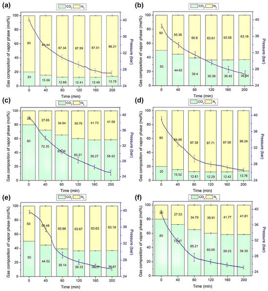 Upon pressurizing the TBAF·29.7 H2O hydrate with a mixed gas containing 20% CO2, an intriguing sequence of events unfolded: initially, CO2 was stored within the hydrate lattice, causing a noticeable reduction in CO2 composition in the gas phase, as illustrated in Figure 6a. However, around the 160 min mark post-initiation of formation, a discernible uptick in N2 uptake appeared, leading to a subsequent increase in CO2 composition within the gas phase. Analogous trends were observed for other mixed gases (Figure 6b,c). As the proportion of CO2 in the mixed gas increased, the diminishment in CO2 concentration within the gas phase became more pronounced, yet over time, N2 depletion also became more conspicuous. This intricate interplay elucidates the differential capture kinetics of CO2 and N2 within the hydrate structure [36,37,38], ultimately impacting separation efficiency.