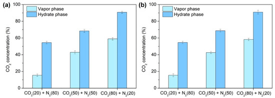 CO2 concentration in the vapor phase and hydrate phase after the formation of semi-clathrate hydrates: (a) TBAF·29.7 H2O, (b) TBAF·32.8 H2O.