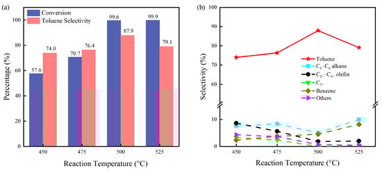 Figure 1 presents the performance evaluation of the P@C catalyst in n-heptane dehydroaromatization at various reaction temperatures (450 °C, 475 °C, 500 °C, and 525 °C) under atmospheric pressure, using a fixed-bed reactor with a WHSV of 0.68 h−1. With increasing reaction temperature, the conversion of n-heptane rises, accompanied by an initial increase and subsequent decrease in toluene selectivity. This trend arises from the exothermic nature of n-heptane aromatization, resulting in enhanced conversion rates at higher temperatures. However, elevated temperatures promote secondary reactions such as hydrogenation and thermal cracking of n-heptane, leading to increased formation of by-products and subsequent reduction in toluene selectivity. Thus, excessively high reaction temperatures impede the dehydroaromatization of n-heptane, with 500 °C identified as the optimal temperature for toluene production, evidenced by significantly higher toluene yields compared to other temperatures. Additionally, Figure 1b depicts the product distribution at different reaction temperatures. Despite minor fluctuations in toluene selectivity under different temperature conditions, toluene remains the predominant aromatic product, highlighting the exceptional regioselectivity of the P@C catalyst in n-heptane dehydroaromatization.