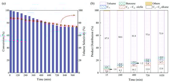Figure 2. The performance of the P@C catalyst in n-heptane dehydroaromatization: (a) n-heptane conversion and toluene selectivity; (b) product distribution at different reaction times. Reaction conditions: 500 °C, catalyst loading of 1.0 g, N2 carrier gas flow rate of 40 mL/min, and an n-heptane model feed flow rate of 1.0 mL/h. Note: Data for product-selectivity below 1.0% are not labeled in figures. The red arrow of the clock in (a) refers to toluene selectivity, and the blue bar chart refers to conversion.