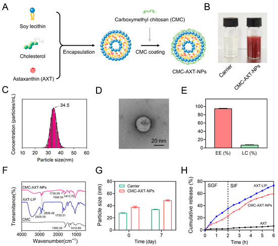 (A) Synthesis scheme of the CMC-AXT-NPs. (B) The appearance photograph of carrier and CMC-AXT-NPs. (C) Particle size distribution, (D) TEM images, (E) EE% and LC% of CMC-AXT-NPs. (F) FT-IR spectra of CMC, AXT-LIPs, and CMC-AXT-NPs. (G) Particle size of carrier and CMC-AXT-NPs after storage at 4 °C for 7 days. (H) In vitro release profile of AXT. Scale bar: 20 nm. Data are presented as mean ± SEM. AXT, astaxanthin; CMC, carboxymethyl chitosan; AXT-LIP, AXT-loaded liposomes; Carrier, CMC-modified AXT-unloaded nanoparticles; CMC-AXT-NPs, CMC-modified AXT-loaded nanoparticles; TEM, transmission electron microscopy; EE, encapsulation efficiency; LC, loading capacity; FT-IR, Fourier-transform infrared spectroscopy; SGF, stimulated gastric fluid; SIF, simulated intestinal fluid.