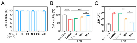 Cell cytotoxicity assessment. (A) Cell viability of Raw264.7 cells treated with different concentrations of CMC-AXT-NPs for 24 h. (B) Cell viability and (C) the level of LDH in Raw264.7 cells stimulated with LPS. Data are presented as mean ± standard error of the mean (SEM); * p < 0.05, ** p < 0.01, *** p < 0.001. NPs, CMC-AXT-NPs; LPS, lipopolysaccharide; LDH, lactate dehydrogenase.