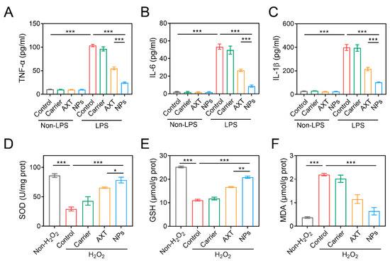 As for the antioxidant experiment, Raw264.7 cells were seeded in 6-well plates and the medium, comprising carrier (250 μg/mL), AXT (125 μg/mL), or NPs (250 μg/mL), was added and incubated for 12 h. Afterwards, the cells were stimulated with H2O2 (500 μmol/L) for another 12 h. Superoxide dismutase (SOD), glutathione (GSH), and malondialdehyde (MDA) were detected in accordance with the biochemical kit (Nanjing Jiancheng Bioengineering Institute, Nanjing, China). To detect the anti-inflammatory effect, Raw264.7 cells were seeded in 96-well plates and the medium containing carrier (250 μg/mL), AXT (125 μg/mL), or NPs (250 μg/mL) was added and incubated for 12 h. Subsequently, the cells were stimulated with LPS (1 μg/mL) and incubated for another 6 h. The content of TNF-α, IL-1β, and IL-6 in the culture supernatants were detected by ELISA kit (Lianke Biotech Co., Ltd., Hangzhou, China) according to the manufacturer’s instructions.