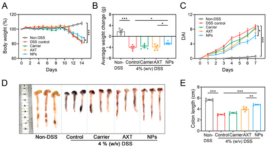 (A) Body weight, (B) average weight change, and (C) DAI in different treated groups. (D) Optical photographs of colons and (E) colon length in different treated groups. Data are presented as mean ± SEM; * p < 0.05, ** p < 0.01, *** p < 0.001. DSS, dextran sulfate sodium; DAI, disease activity index.