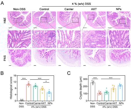 As depicted in Figure 5A, the colon tissues in the DSS-control group exhibited extensive disruption of the crypt structure, along with prominent inflammation infiltration and ulceration compared to the non-DSS control group. However, the pathological damage of the colon tissues was significantly improved in the groups treated with AXT and CMC-AXT-NPs, mainly characterized by the presence of less-obvious ulcers, reduced inflammatory infiltration, and slight damage to the crypts. Interestingly, the group treated with CMC-AXT-NPs displayed almost normal histological structure with significantly reduced inflammation infiltration in the mucosa. Moreover, the histological scoring and analysis of crypt depth further supported the efficacy of CMC-AXT-NP treatment, as the mice treated with CMC-AXT-NPs had significantly lower scores and improved crypt depth compared to those treated with DSS alone (Figure 5B,C). This implied that AXT-loaded nanoparticles effectively intervened in the inflammation and crypt damage in the colon tissues. Furthermore, the colon tissues were stained with periodic acid–Schiff (PAS) to evaluate the thickness of the mucous epithelium and the presence of goblet cells. The groups treated with free AXT and CMC-AXT-NPs showed a mild improvement in the decrease in goblet cells, which further supported the results obtained from the histological observations and scores of the colon tissues (Figure 5B). In conclusion, the CMC-AXT-NPs demonstrated the ability to ameliorate the intestinal lesions induced by DSS treatment and exhibited superior capabilities in protecting and maintaining the integrity of the gastrointestinal tract compared to free AXT. These findings suggested the potential therapeutic application of CMC-AXT-NPs in the treatment of colon tissue inflammation and damage.