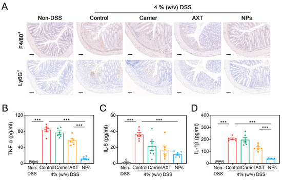 It is well-known that the immune dysfunction is the root cause of the dominating development of IBD [39]. In murine colitis models, there is an observed increase in the infiltration of monocytes and macrophages into the colon mucosa, which are responsible for the production of various inflammatory mediators [51,52]. In agreement with the previous report, there was a notable increase in the recruitment of neutrophils and macrophages in the colon tissues of the DSS-control group compared to the non-DSS control group (Figure 6A), indicating severe inflammation in the intestines [53]. Numerous reports revealed that by reducing the influx of inflammatory cells into the affected intestinal tissues, the overall inflammatory burden could be significantly decreased in DSS-induced colitis [53,54]. As shown in Figure 6A, intervention with AXT and CMC-AXT-NPs obviously alleviated the infiltration of neutrophils and macrophages in the colon tissues, suggesting that they had a good ability to maintain intestinal immune homeostasis and relieve intestinal tract injury [53,54]. There is accumulating evidence that pro-inflammatory cytokines, such as TNF-α and IL-6, play a crucial role in the development of IBD [55]. After administration of DSS, significantly higher levels of serum TNF-α, IL-6, and IL-1β were observed compared to the non-DSS control group, confirming the increasing trend of inflammation in the pathogenesis of colitis (Figure 6B–D). However, treatment with free AXT and AXT-loaded nanoparticles led to a decrease in the expression of pro-inflammatory cytokines compared to the mice in the DSS-control group, suggesting that AXT promoted the recovery of inflamed colon tissue by inhibiting the secretion of inflammatory cytokines (Figure 6B–D). Especially in the CMC-AXT-NP-treated group, the levels of TNF-α, IL-6, and IL-1β were reduced by 86.4%, 68.4%, and 81.9%, respectively, compared to those in the DSS-control group. The remarkably improved anti-inflammatory effects of CMC-AXT-NPs could be attributed to the preferable oral bioavailability and the sustained-release behavior of the nano-delivery systems [35]. In conclusion, these findings provided strong evidence that the anti-inflammatory activity of AXT was notably enhanced by employing CMC-modified nanoparticles as the delivery system.