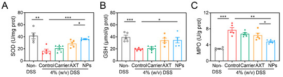 Numerous pieces of evidence suggest that IBD is linked to the increased production of reactive species [56]. Oxidative stress not only directly disrupts the intestinal barrier, which leads to cell dysfunction and tissue damage in the colon, but also causes dysregulation of multiple cell types, such as intestinal epithelial cells and immune cells [56,57]. To determine the impact of CMC-AXT-NPs on oxidative stress in mice with UC, the levels of oxidative stress markers were measured. The results in Figure 7A,B indicate that the levels of SOD and GSH significantly decreased after DSS administration compared to the non-DSS control group, indicating the occurrence of oxidative stress [58]. However, when AXT and CMC-AXT-NPs were supplemented, the levels of SOD and GSH significantly increased, demonstrating a potential antioxidant effect. It is worth noting that the level of SOD in the AXT-loaded nanoparticle-treated group was 1.3 times higher than that in the AXT-treated group. This improvement suggests that CMC-AXT-NPs were more effective in relieving oxidative stress compared to the use of free AXT. Various factors, such as enhanced stability, increased bioavailability, and controlled drug-release in the colon, may have contributed to this improvement. By utilizing CMC-modified nanoparticles, the efficacy of AXT was enhanced, resulting in a superior protective effect against DSS-induced oxidative stress. Moreover, treatment with CMC-AXT-NPs significantly reduced the levels of myeloperoxidase (MPO) compared to the DSS-control group and showed the most effective alleviation among all intervention groups (Figure 7C). In summary, CMC-modified AXT-loaded nanoparticles exhibited excellent antioxidant effectiveness in vivo, which was consistent with the findings in the cellular experiment.