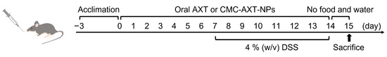 The potential therapeutic benefits of the oral administration of AXT nanoparticles for the treatment of UC were investigated in a mouse model induced by DSS [62]. The specific pathogen-free male C57BL/6 were obtained from Weitong Lihua Experimental Animal Technology Co., Ltd. (Beijing, China). Mice between 8 and 10 weeks were randomly allocated to different experimental groups: non-DSS control group, DSS-control group, carrier group, AXT group, and NP group. All experiments were conducted based on the schedule depicted in Figure 8. Briefly, after three days of acculturation, mice in the carrier, AXT, and NP groups were gavaged with carrier (20 g/kg/d), pure AXT, or NPs (dosage of AXT was 1 mg/kg/d), respectively, in the first weeks. Then, except the non-DSS control group, mice in the other groups were given freely a drink of 4% DSS for 7 days to induce colitis. The mice were anesthetized and sacrificed at the end point, and the serum and colons of the mice were harvested. All animal experiments were reviewed and approved by the Institutional Animal Care and Use Committee of the Chinese Academy of Medical Sciences and Peking Union Medical College.