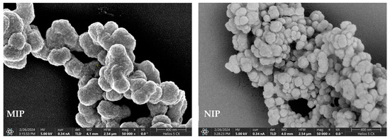 Figure 2 shows images of the MIPs and NIPs obtained through scanning electron microscopy (SEM). In the figure, one can clearly see that the MIPs and NIPs had obvious differences in morphology, size, and other aspects. The MIPs ranged from 150 to 200 nm, and the NIPs ranged from 90 to 140 nm. The surface of the MIPs was rougher than that of the NIPs, which may have been because the MIPs synthesized by adding template molecules left many imprinted cavities after elution from the template. In contrast, NIP synthesis was performed without the addition of template molecules, and there were no specific cavity structures and significantly smaller particles.