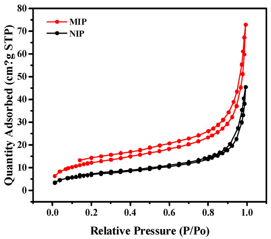 Figure 3 shows that the adsorption isotherms of both the MIPs and NIPs were H2-type hysteresis loops with mesoporous structures. The specific surface area of the MIPs was 60.90 m2/g. Compared with the NIPs at 34.88 m2/g, the MIPs had a larger specific surface area and more imprinting sites. The pore volumes of the MIPs and NIPs were 0.11 cm3/g and 0.07cm3/g, respectively, which further indicated that the MIPs had more specific adsorption holes. In addition, the pore width of the MIPs (10.99 nm) was smaller than that of the NIPs (14.29 nm).