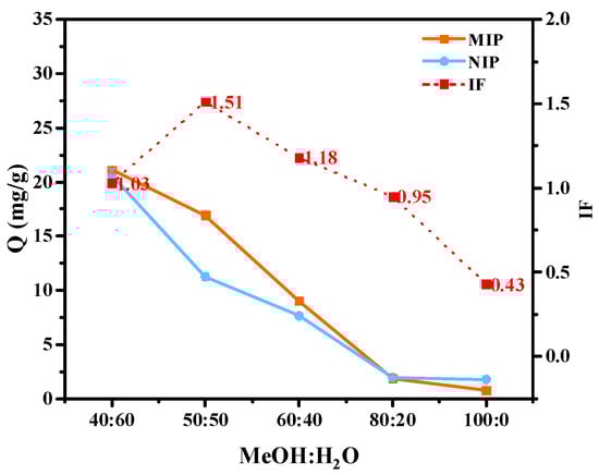 The adsorption solvent had a significant influence on the adsorption effect, and the following were the results of the adsorption experiment with different proportions of MeOH and H2O as the adsorption solvent. Figure 4 shows that the adsorption also exhibited an overall decrease with the decrease in the H2O ratio, but when the MeOH:H2O ratio was in the range of 40:60 to 50:50 (v/v), the IF of the rapidly MIPs increased and then decreased from 50:50 to 100:0 (v/v). As for the finding that the adsorption capacity gradually decreased with the increase in MeOH content, this was because the imprinted molecules were soluble in MeOH but not easily soluble in water. When the water content was higher, the imprinted molecules tended to enter the MIPs, and the adsorption capacity was higher. In addition, solvent experiments with higher water ratios were not performed, although a higher water content resulted in greater adsorption because the water compatibility of the flavonoids was very poor, and they were almost insoluble in pure water.