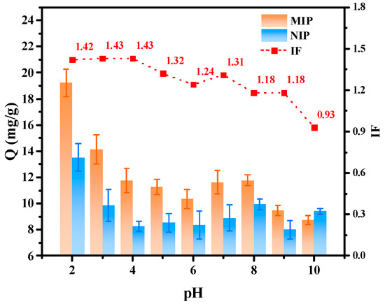 Figure 5 shows the Q and IF of myricetin with the MIPs and NIPs in the adsorption solvent (MeOH:H2O = 50:50) at different pH levels. As the pH increased, the IF decreased as a whole, but it increased at pH = 7 and then began to decrease again. Firstly, the myricetin adsorption ability of the MIPs was the highest at pH = 2, as with other flavonoids (S1), and the adsorption ability of the MIPs increased with the increase in acidity. This is because, in acidic solutions, flavonoids mainly exist in molecular form, and their polyhydroxy structure is more likely to combine with MAA to form hydrogen bonds. However, with the increase in the pH from 4, the carboxyl group of MAA (pKa = 4.66) may have been partially or completely ionized and negatively charged. At this time, myricetin (pKa = 6.30) was also partially ionized. This negatively charged state affected the hydrogen bond interactions between MAA and the imprinted molecules, thereby affecting the adsorption effect. In this experiment, this resulted in a gradual decrease in the adsorption capacity of the material with increasing pH (pH 4–6), as well as a decrease in IF. However, when the pH was between 6 and 7, the IF of all flavonoids showed an inflating point because when the pH gradually increased, the OH− content of the flavonoids increased, the hydrogen bond with MAA strengthened, and the increase in specific binding led to an increase in the IF value. However, with the further increase in alkalinity (pH > 7), although the hydroxyl group of flavonoids was also ionized in the negative state, the amount of OH− in the solvent also increased, and the carboxylic acid of MAA was more likely to form hydrogen bonds with the solvent, which weakened the hydrogen bond between the template molecule and the functional monomer, and the IF value gradually decreased with the increase in pH. The adsorption results of this material for other flavonoids were similar. In order to determine the appropriate pH of the material for other flavonoids at the same time although the MIPs had a better adsorption effect on myricetin at pH = 4 or 7 and to realize the differences in the abilities of MIPs to adsorb to a series of flavonoids, the condition of pH = 6 was selected for the subsequent experiments.