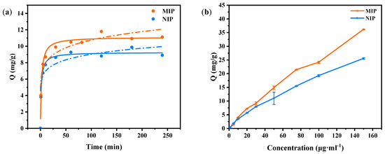 Figure 6a shows the kinetic curves of the adsorption of myricetin by the MIPs and NIPs. Analysis of the Langmuir and Freundlich isothermal models was performed using the static adsorption of the MIPs and NIPs. The adsorption type of the MIPs and NIPs was more consistent with the Langmuir adsorption isotherm formula. It can be seen in the figure that the two curves had the same trend, but they had obvious differences in the adsorption amount, which was mainly due to their structure. There were large numbers of imprinted holes on the surface of the MIPs synthesized by adding template molecules through the surface imprinting method, and they had a high affinity with the template molecules. These holes were able to quickly adsorb imprinted molecules (0–10 min) and could reach a high adsorption capacity in a short time. As the adsorption time passed, the imprinted holes were gradually occupied, and the adsorption rate gradually decreased. Finally, adsorption equilibrium was reached at 120 min, and the adsorption capacity reached 11.80 mg/g. In contrast, the synthesis process for NIPs did not include the addition of template molecules, so there were no specific cavity structures on the surface to combine with myricetin molecules. The functional monomers were arranged disorderedly in the imprinted layer on the surface. Although the imprinted molecules also bound to it, the adsorption of the NIPs to myricetin was non-specific, with a low adsorption rate and low adsorption capacity. Moreover, because there were no specific hole structures on the surface of the NIPs, the mass transfer resistance of the template molecules was small; the time taken to reach adsorption equilibrium was relatively short at 60 min, and the adsorption amount was 9.27 mg/g.