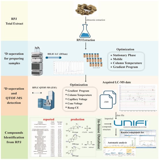- Yang, W.; Zhang, J.; Yao, C.; Qiu, S.; Chen, M.; Pan, H.; Shi, X.; Wu, W.; Guo, D. Method development and application of offline two-dimensional liquid chromatography/quadrupole time-of-flight mass spectrometry-fast data directed analysis for comprehensive characterization of the saponins from Xueshuantong Injection. J. Pharm. Biomed. Anal. 2016, 128, 322–332. [Google Scholar] [CrossRef] [PubMed]