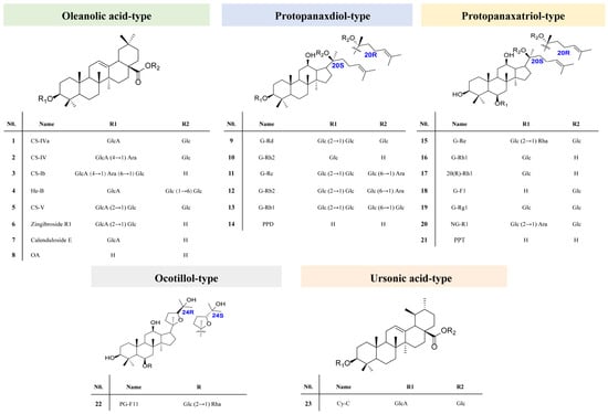 The structures of 23 reference saponins used in the study: G, Ginsenoside; NG, Notoginsenoside; CS, chikusetsusaponin; Cy-C, Cynarasaponin C; He-B, hemsgiganoside B; PG-F11, Pseudoginsenoside F11; Glc, glucose; Rha, rhamnose; Ara, arabinose; Xyl, xylose; GlcA, glucuronic acid.