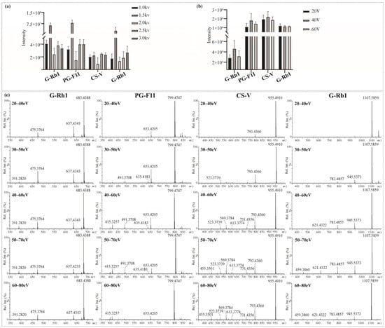 Collision energy (CE) is vital to induce dissociation of protonated or deprotonated parent ions [37]. In MS, deglycosylated fragments and sapogenin ions are the main diagnostic ions of saponins. Specifically, we selected G-Rh1, PG-F11, CS-V, and G-Rb1 as representative saponins with one to four sugar units, respectively. Optimization of CE was carried out within specific energy ranges: 20–40 eV, 30–50 eV, 40–60 eV, 50–70 eV, and 60–80 eV. As shown in Figure 3c. The energy required to generate sapogenin ions increased with the number of glycosidic bonds to some extent. G-Rh1, a monoglycoside, produced relatively high levels of m/z 475.3764 [sapogenin − H]− and its fragments m/z 391.2820 at lower energy (CE 30–50 eV). The optimal CE for PG-F11 (diglycoside) and CS-V (triglycoside) was 40–60 eV and 50–70 eV, respectively. In contrast, G-Rb1 (tetraglycoside) generated m/z 475.3764 [sapogenin − H]− at higher collision energies of 50–70 eV and 60–80 eV. Notably, at CE 50–70 eV, the mass spectra of the four saponins showed a variety of fragments and relatively high levels of aglycone ions. Therefore, the collision energy was set at 50–70 eV in the MS measurement of the sample.