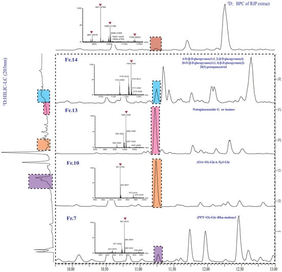 The assessment of the offline 2D LC system’s separation performance involved orthogonality and peak capacity. By applying asterisk Equations [38], the spreading of 23 reference saponins was calculated, resulting in an orthogonality value of 0.61 (Figure 4). The parameters of the four crossing lines were calculated at 0.92 (Z−), 0.56 (Z+), 0.98 (Z1) and 0.72 (Z2), respectively. The 1D and 2D-LC exhibited a peak capacity of 97 (mean peak width 0.33 min) and 135 (mean peak width 0.27 min), respectively. Consequently, the 2D LC system exhibited a theoretical peak capacity of 13,175, with an effective peak capacity of 1249. These results indicated that the developed offline HILIC × RP LC system significantly enhanced the resolution of saponins in RPJ. For example (Figure 5), the chromatographic peak at tR 11.23 min of RPJ extract detected by RP-LC/QTOF-MS potentially contained four coeluted compounds (m/z 1169.6055, m/z 1005.5336, m/z 941.4769, m/z 887.4979). Characterizing their structures based on MS2 data was challenging due to the mixed fragment ions of all the coeluted compounds. However, the developed 2D LC-MS system successfully distributed these saponins in Fr.14, 13, 10 and 7, and identified as 6-O-[β-d-glucopyranosyl-(1,2)-β-d-glucopyranosyl]-20-O-[β-d-glucopyranosyl-(1,4)-β-d-glucopyranosyl]-20(S)-protopanaxatriol or isomer, notoginsenoside G or isomer, (OA+O)-GlcA-Xyl-Glc and (PPT+O)-Glc-Rha-malonyl. This result highlights the significant advantage of the offline 2D LC-MS system in resolving coeluted and trace components in samples.