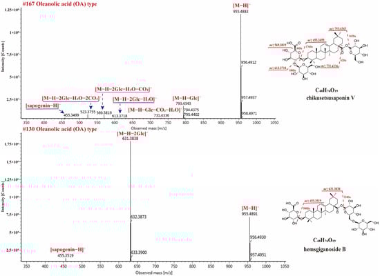 PPD or PPT-type saponins with dehydrated on sapogenin and varied C17 side chains have been reported from P. genus [29,44]. In the present study, 19 and 38 compounds of these types were characterized, which usually yield [sapogenin − H]− ion and specific fragments of the C17 side chain. For example, Compound 284 (tR, 28.04 min) gave abundant ions at m/z 827.4825 ([M + HCOO]−) and 781.4734 ([M − H]−), which are consistent with the formula C42H70O13. Its [M − H]− ion yielded fragments of m/z 619.4333 ([M − H − Glc]−), 457.3685 ([M − H − 2Glc]−) and 373.2753 ([M − H − 2Glc − C6H12]−). The neutral losses of the sugar chain and C6H12 indicated that compound 284 was ginsenoside 5-ene-PPD-Glc-Glc. Compound 31 (tR, 7.78 min) was firstly identified in RPJ. It yielded m/z 861.4861 ([M + HCOO]−) and 815.4783 ([M − H]−) ions, indicating the formula C42H72O15. The fragments m/z 669.4212, 507.3681, and 491.3747 were assigned to [M − H − Rha]−, [M − H − Rha − Glc]−, and [M − H − Rha − Glc − H2O]− ions, respectively. The ion at m/z 507.3681 suggested two methyl substitutions in the side-chain of the aglycone (PPT). As reported in the literature [45], compound 31 was identified as floralquinquenoside B. Similar fragmentation behavior was also observed in compound 10 (C41H72O15), which generated ions at m/z 803.4777 ([M − H]−), 671.4326 ([M − H − Xyl]−), 509.3869 ([M − H − Xyl − Glc]−), and 391.2929 ([M − H − Xyl − Glc − C6H14O2]−). The fragments at m/z 509.3869 and m/z 391.2929 indicated that its aglycone was 23,24-OH-PPT. Therefore, compound 10 was characterized as 23,24-OH-PPT-Glc-Xyl.