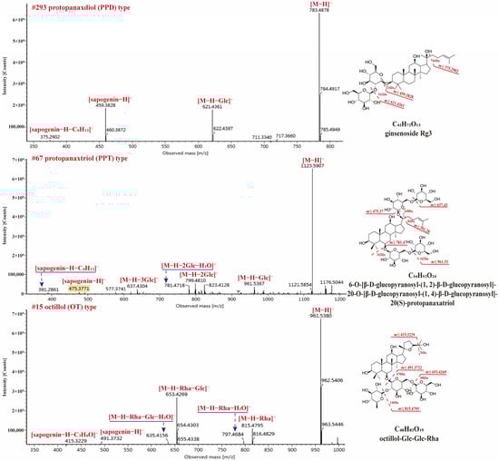 PPT and PPD types are the main dammarane-type saponins in P. species. 31 PPD-type and 48 PPT-type saponins have been identified from RPJ in this study and they commonly produced [M − H]− and/or [M + HCOO]− in negative ion mode. The major diagnostic fragments of PPT and PPD-type were observed at m/z 475.3764 (C30H51O4) → 391.2820 and 459.3860 (C30H51O3) → 375.2902, respectively. Compound 67 (tR, 11.26 min) gave [M + HCOO]− and [M − H]− ions at m/z 1169.5959 and 1123.5907, respectively, corresponding to the formula C54H92O24 (Figure 7). The [M − H]− ion generated diagnostic fragments at m/z 475.3771 ([M − H − 4Glc]−) and 391.2861 ([M − H − 4Glc − C6H12]−), along with m/z 961.5367 ([M − H − Glc]−), 799.4810 [M − H − 2Glc]−, 781.4718 ([M − H − 2Glc − H2O]−) and 637.4304 ([M − H − 3Glc]−) ions. So, Compound 67 was characterized as 6-O-[β-d-glucopyranosyl-(1,2)-β-d-glucopyranosyl]-20-O-[β-d-glucopyranosyl-(1,4)-β-d-glucopyranosyl]-20(S)-protopanaxatriol. Compound 293 (tR, 28.44 min), the molecular formula C42H72O13 was confirmed by m/z 829.4951 ([M + HCOO]−) and 783.4878 ([M − H]−). The parent ion (m/z 783.4878) lost two Glc residues and gave m/z 459.3828 ([sapogenin − H]−) and 375.2902 ([sapogenin − H − C6H12]−) ions (Figure 7). Its molecular formula and cleavage behavior were consistent with ginsenoside Rg3 [43]. In addition, 16 OT-type saponins have been identified from RPJ and their characteristic ions were at m/z 491.3708 and 415.3257 in negative ion mode. Compound 15 (tR, 5.47 min) showed abundant [M + HCOO]− and [M − H]− ions at m/z 1007.5425and 961.5380, corresponding to the formula C48H82O19 (Figure 7). Fragment ions at m/z 815.4795 ([M − H − Rha]−), 797.4684 ([M − H − Rha − H2O]−), 653.4269 ([M − H − Rha − Glc]−), 635.4156 ([M − H − Rha − Glc − H2O]−), 491.3732 ([M − H − Rha − 2Glc]−), and 415.3229 ([M − H − Rha − 2Glc − C3H6O]−) were observed in MS2 spectra. Thus, compound 15 was identified as octillol-Glc-Glc-Rha.
