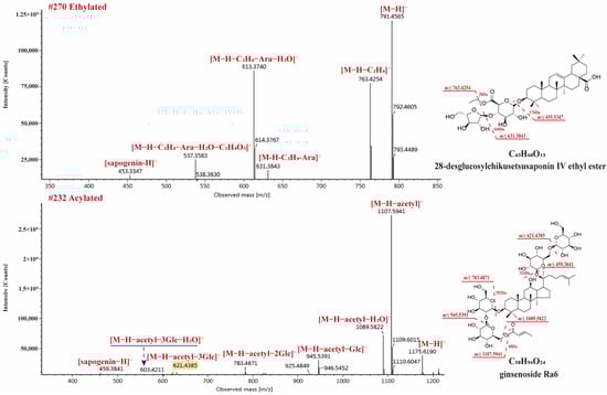On the other hand, dammarane-type saponins containing acetyl/malonyl substituents are also reported from P. species [8,36], and these substituents are usually at C20-sugar chain. We also found 2 malonylated and 16 acetylated saponins from RPJ in this study. In negative ion mode, these saponins exhibited [M − H − acetyl]− and [M − H − acetyl − H2O]− diagnostic fragments, consistent with previous reports [36]. Compound 232 (tR, 25.75 min, C56H94O24) showed [M + HCOO]− and [M − H]− ions at m/z 1221.6252 and 1175.6190, respectively. In MS2, the high intensity of ions at m/z 1107.5941 [M − H − acetyl]− and 1089.5822 [M − H − acetyl − H2O]− were observed, accompany with fragments at m/z 945.5391 [M − H − acetyl − Glc]−, 783.4871 [M − H − acetyl − 2Glc]−, 621.4385 [M − H − acetyl − 3Glc]−, 603.4211 [M − H − acetyl − 3Glc − H2O]−, and 459.3841 [M − H − acetyl − 4Glc]−. Compound 232 was identified as ginsenoside Ra6.
