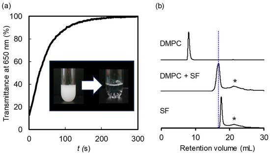First, we investigated the effect of SF on the solubilization of phospholipids. Our approach involved the preparation of DMPC multilamellar vesicles (MLVs) within phosphate-buffered saline (PBS) [16]. The aqueous suspension of MLVs (1 mM) exhibited turbidity. Subsequently, SF was introduced to the turbid solution in a 1:1 DMPC:SF molar ratio. By maintaining the transmittance at 650 nm, we found that within 240 s, SF induced the solubilization of the MLVs to form a transparent solution (Figure 1a). This result clearly revealed the distinct ability of SF to solubilize DMPC. The size-exclusion chromatography (SEC) analysis of DMPC displayed a peak at 8.3 mL, which is the void volume originating from the MLVs, while the addition of SF to the MLVs yielded a peak at 16.8 mL with a Stokes diameter of 8.5 nm (Figure 1b). The diameter of the SF and DMPC mixture exceeded that of the SF micelle (the elution curve displayed a peak at 17.5 mL), corresponding to an estimated Stokes diameter of 6.8 nm. Notably, the Stokes diameter of the DMPC/SF mixture was increased with increasing DMPC molar ratio (8.8 nm at DMPC/SF = 2/1, 10.6 nm at DMPC/SF = 3/1, and 11.7 nm at DMPC/SF = 4/1). These results elucidate the formation of a lipid–peptide complex from DMPC and SF, leading to the formation of nano-sized aggregates.