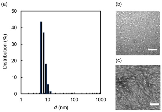 The dynamic light scattering (DLS) measurement of the transparent solution (SF = DMPC = 1 mM) revealed a notably narrow size distribution, with an average diameter of 6.8 ± 1.4 nm, as shown in Figure 2a. Notably, the average diameter aligned closely with the SEC analysis (Figure 1b). To confirm the morphology of the nano-sized aggregates formed from the mixture of DMPC and SF, a negative-stain transmission electron microscopy (NS-TEM) analysis was performed. The captured images of the aliquots depicted both circular (Figure 2b) and rectangular objects (Figure 2c). The difference in morphology between the images was probably caused by the NS-TEM protocol. In the case of Figure 2b, uranyl acetate was used as the stain, while phosphor tungstic acid was used in the case of Figure 2c. The size of the circular objects (7.3 ± 1.6 nm) is comparable to those obtained from the DLS and SEC analyses. The thickness of the rectangular objects roughly estimated by the NS-TEM image was 4.8 ± 0.9 nm, which corresponds well to the thickness of the DMPC bilayers (ca. 5.1 nm) constructing nanodiscs with membrane scaffold proteins [22]. This result partially supports the beltlike model of nanodisc structure. Notably, some rectangular objects were stacked into a rouleaux formation in the image. These NS-TEM images consistently paralleled those typically associated with nanodiscs where the phospholipid bilayer membranes are stabilized by membrane scaffold proteins [7], peptides [16,17,18], or polymers [23].