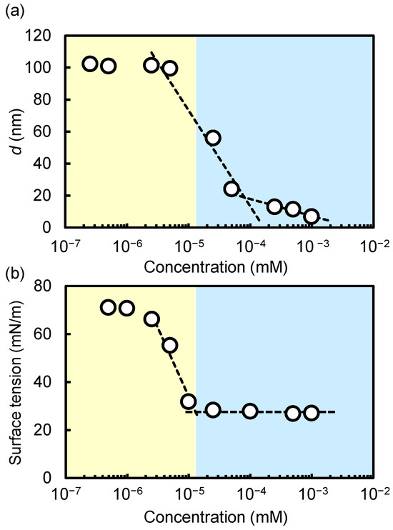 The concentration-dependent variations in the average diameter of the DMPC/SF (=1/1) mixed solutions showed that the average diameters remained relatively constant below 10−5 M, gradually decreasing as concentrations surpassed 10−5 M (Figure 3a). The concentration was highly consistent with the critical aggregation concentration (CAC) of SF in PBS (1.3 × 10−5 M), as shown in Figure 3b. When SF is adsorbed at the air–water interface, the alkyl chain is directed out of water and the cyclicpeptide moiety is directed into water. Previously, we have reported that an SF monolayer exhibited a liquid expanded monolayer at the air–water interface, demonstrating that the SF is in a loose molecular packing state owing to its bulky heptapeptide ring [24]. When the interface is completely occupied by SF, the excess molecules of SF start to aggregate into micelles. Indeed, the SEC analysis of an SF solution above CAC shows the formation of micelles whose diameter was estimated to be 6.8 nm, as shown in Figure 1b. Thus, above the CAC, SF micelles solubilize MLVs. Thus far, the results clearly demonstrate that nanodisc formation is induced in the presence of SF above its CAC: SF adsorbs at the air–water interface at low concentrations, and after reaching its adsorption equilibrium, it begins to form self-associates in aqueous solution.
