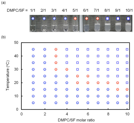 (a) Visual observation of the solutions of DMPC/SF mixtures at different molar ratios (25 °C). (b) Phase diagram of DMPC/SF mixture at different temperatures. Initial concentrations of SF were all set to 20 mM. Each blue circles represent a transparent solution of low viscosity, the blue squares represent turbid solutions of low viscosity, and the red circles represent transparent solutions of high viscosity.