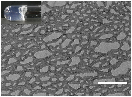 TEM image of a hydrogel prepared using the freeze-etching technique (SF = 20 mM; DMPC = 100 mM in a PBS buffer at pH 7.4; scale bar = 200 nm). The inset shows a photograph of the hydrogel sample.
