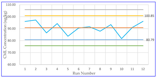 The quality control in every run day or batch is described in Figure 2. The mean CML concentration derived from 12 quality control food samples is shown by the red line. The yellow and soft blue lines refer to the mean ± 2 SD. The grey and green lines refer to the mean ± 3 SD. The quality control tests using CML spiked in fried tilapia do not exceed the mean ± 2 SD. The QC measurements are closer to the true value.