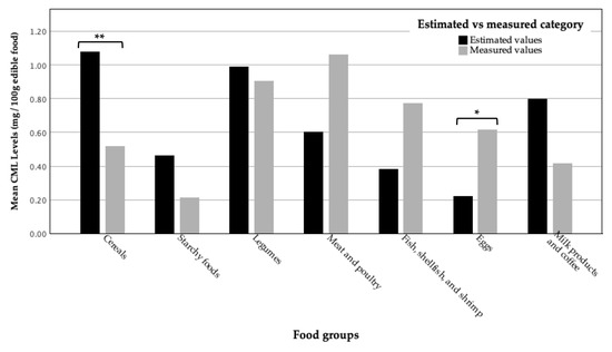 We found a significant difference between the estimated (0.80 CML/100 g edible food) and directly measured (0.66 CML/100 g edible food) CML values, at p = 0.035. When viewed by food group, there was a difference between the estimated and measured CML content in the cereals (p < 0.001) and egg groups (p = 0.012), but not in the groups of starchy foods, legumes, meat and poultry, fish, shellfish and shrimp, and milk products and coffee (p > 0.05 in all groups), as shown in Figure 3.