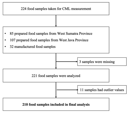Food selection was based on the foods most consumed in the study of Liman et al. [40]. The foods were grouped according to the Indonesian Food Composition Table (TKPI), as described in that study [40]. The food items were listed and ranked according to the highest consumption and included those that were assumed to have a high CML value per 100 g edible food. A total of 224 food samples were selected, consisting of 192 prepared food samples that were obtained from the two provinces and 32 samples of manufactured foods, as shown in Figure 4.