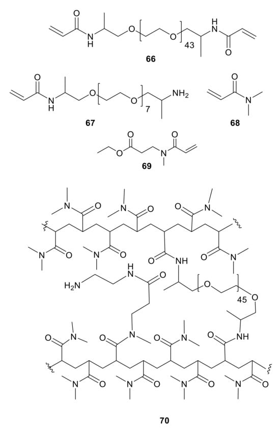Chemistry underlying PEGA [polyethylene glycol-poly-(N,N-dimethylacrylamide) copolymer] supports. In Meldal’s original report [136], monomers 66, 67, and 68 were copolymerized. Note that 67 provides (right side of structure, as drawn) an amino functionality for subsequent synthesis. A few years later, Renil and Meldal [137] developed a modified PEGA, again using 66, but now adding acryloyl sarcosine ethyl ester (69) in place of 67. In this case, the needed amine functionality was established by treating the polymer with 1,2-ethylenediamine, resulting in a support (70) that was suitable for SPPS and SPOS.