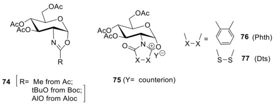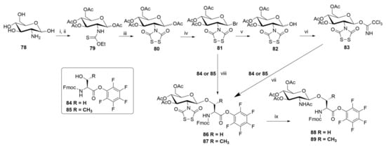 Both research groups successfully made the SPPS building blocks Nα-Fmoc-Ser(Ac3-β-d-GlcNDts)-OPfp (86) and Nα-Fmoc-Thr(Ac3-β-d-GlcNDts)-OPfp (87) by relatively similar multi-step routes starting from d-glucosamine hydrochloride (78) (Scheme 14 which consolidates findings from refs. [142] and [143]). The use of Dts in this manner was a significant innovation because, when working directly with N-acetyl-d-glucosamine (GlcNAc) derivatives or when the 2-amino group is protected by a urethane (e.g., Boc, Aloc, etc.), the appropriate glycosyl donors are readily converted to unreactive oxazoline intermediates (see structure 74 in Figure 2). On the other hand, when the 2-amino group is protected by two acyl-type groups (i.e., bis(protection) like N,N-diacetyl) or, even better, by a bivalent protecting group (e.g., Phth, 76 in Figure 2) that covers both free valences of the nitrogen, oxazolines cannot form. Instead, oxazolinium ions (see structure 75 in Figure 2) are formed, which are highly reactive and continue to give exclusively 1,2-trans-glycosides. Ostensibly, this would be a good outcome, were it not for the fact that harsh final deprotection conditions [e.g., hydrazine hydrate in EtOH–H2O (9:1) aqueous alcohol, 16 h reflux] are accompanied by undesired β-elimination of the glycan from Ser or Thr. As shown independently by both the Copenhagen and Minneapolis groups, all of these problems are neatly circumvented by using Dts protection (77 in Figure 2).