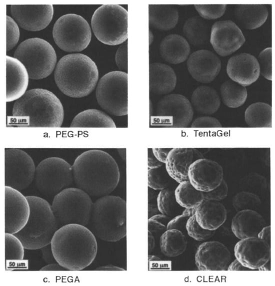 Regardless of how it is formulated, PEG–PS proved to have several useful properties that differentiate it from PS. Thus, PEG–PS is compatible with an extended array of solvents, e.g., acetonitrile, that go beyond the chlorinated hydrocarbons (e.g., CH2Cl2) and polar amides [e.g., N,N-dimethylformamide (DMF), N,N-dimethylacetamide (DMA), and N-methyl-2-pyrrolidinone (NMP)] used with PS; PEG–PS is resistant to high pressures, allowing its use in flow-through reactors that represent an attractive alternative to the batch-based methods that are the norm when working with PS; and PEG–PS facilitates assorted biological assays, as well as treatments with enzymes, that must be carried out in aqueous milieus.