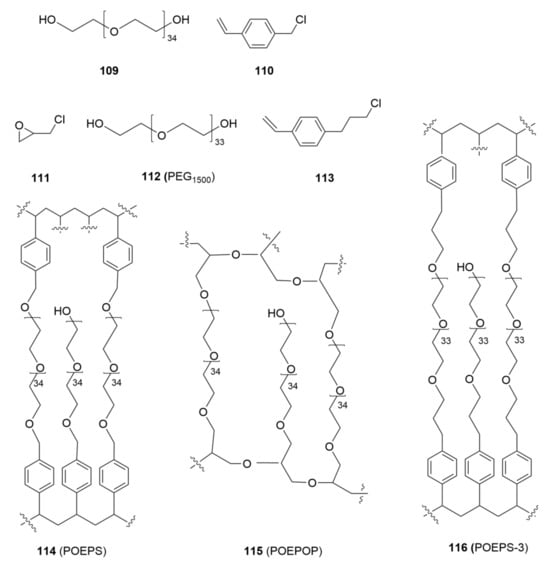 - Renil, M.; Meldal, M. POEPOP and POEPS: Inert polyethylene glycol crosslinked polymeric supports for solid synthesis. Tetrahedron Lett. 1996, 37, 6185–6188. [Google Scholar] [CrossRef]
