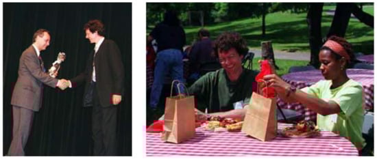 Some details of the Copenhagen visit remain etched in GB’s memory to this very day: Morten’s keen intellect and curiosity along with his kind hospitality and personal generosity; insightful conversations with Klaus Bock and others at Carlsberg as a follow-up to the lecture and continuing for a second day; the gift of a coffee table size book about the historic scientific legacy of the institution [134,135], which includes introduction of the pH scale by Søren P.L. Sørensen (1868–1939) and fundamental protein biophysical chemistry from Kaj Linderstrøm-Lang (1896–1959) and his school; a photo-op in front of the building where Niels Bohr was born29 in 1885; an initial meeting and delightful dinner with Meldal’s first graduate student at the Carlsberg Laboratory, Knud Jensen, in whom GB planted the seed to eventually pursue postdoctoral studies in Minneapolis; accommodations at the elegant Hotel 3 Falke (now Falkoner) which has a concert hall as part of the complex (GB was able to score a ticket to one of his favorites, Verdi’s rarely performed opera Nabucco with its famous chorus of the Hebrew slaves); returning to the hotel room just before midnight local time on Friday night and watching CNN (the only English language channel available) until almost dawn Saturday30; being driven through town for some sightseeing which included the Little Mermaid statue in the harbor and the Tivoli fairgrounds.
