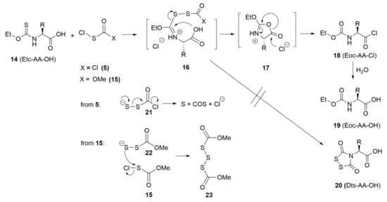 Attempts to prepare Dts-amino acids (20) by direct application of ZWK chemistry to Etc-amino acids (14) with free α-carboxyl groups [101]. Thionourethane substrates 14 were treated with sulfenyl chlorides 5 or (as a control) 15. Depending on the precise conditions of the workup, urethane derivatives 18 (an acid chloride) or 19 (free α-carboxyl) were the exclusive amino acid-containing products. Co-products when using 5 were elemental sulfur (S), gaseous COS, and HCl (the acid, or its salt if the reaction was carried out in the presence of a tertiary amine). When 15 was used, the principal organic co-product was bis(methoxycarbonyl)trisulfane (23), admixed with smaller amounts of the corresponding di- and tetrasulfanes (formed via disproportionation); all structures confirmed by comparison to standards made by alternative, unambiguous methods [103]. This Scheme, by invoking intermediates 16 and 17, shows likely mechanisms for all of these results. Successful methods to prepare Dts-amino acids (20) are described in the text.