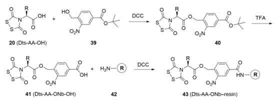 Following a “preformed handle” strategy (Scheme 8), Dts-amino acids (20) were coupled to tert-butyl 4-(hydroxymethyl)-3-nitrobenzoate (39), as mediated by N,N′-dicyclohexylcarbodiimide (DCC), to provide intermediates 40, which were treated with TFA to give crystalline 4-(Nα-dithiasuccinoylaminoacyloxymethyl)-3-nitrobenzoic acids (41). Next, DCC-mediated couplings of 41 onto amino-containing supports (42) provided starting Dts-amino acid-handle–resins 43, and chain elongations proceeded by cycles involving (i) deprotection with β-mercaptoethanol (0.5 m)–DIEA (0.5 m) in CH2Cl2 (2 × 2 min) and (ii) coupling with DCC in CH2Cl2 (90 min), confirmed to have reached completion by a negative ninhydrin test [116]. The resultant Dts-Tyr(tBu)-Gly-Gly-Phe-Leu-ONb–resin was then cleaved in several ways, resulting in four partially or fully deblocked leucine-enkephalin derivatives: Dts-Tyr(tBu)-Gly-Gly-Phe-Leu-OH, Dts-Tyr-Gly-Gly-Phe-Leu-OH, H-Tyr(tBu)-Gly-Gly-Phe-Leu-OH, and H-Tyr-Gly-Gly-Phe-Leu-OH. All of these were obtained in good yields and purities, and clearly establish all three dimensions of orthogonality. Importantly, the overall reaction sequences used were entirely free of racemization.