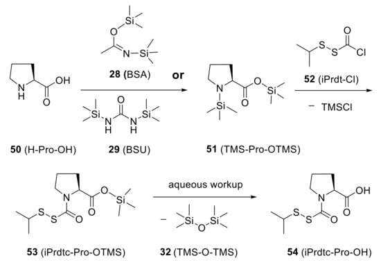 Preparation of N-(iso-propyldithio)carbonyl-l-proline (54), the open-chain carbamoyl disulfide-protected derivate of proline that complements Dts protection for the other 19 proteinogenic α-amino acids. The chemistry of carbamoyl disulfides was initially established when they were detected as intermediates in the thiolytic removal of Dts (Scheme 7 and accompanying references). The shown chemistry was developed by one of us (GB) towards the beginning of his independent professional career at the University of Minnesota [107]. Either BSA (28) or BSU (29) (this latter is a result from ref. [101]) can be used to create the bis(trimethylsilylated) derivative 51 in situ, whereupon it was acylated further with 52. Alternatively (as described in ref. [107] but not drawn out in the present Scheme), we treated proline (50) with trimethylsilyl chloride (55, TMSCl) in CHCl3–CH3CN (4:1; 2 h reflux) to generate HCl.Pro-OTMS (56) in situ, which was then acylated with 52 in the presence of Et3N (2 equiv) at ~0 °C. Independent of our work [107], Wünsch and coworkers investigated (alkyldithio)carbonyl protection of α-amines [118].
