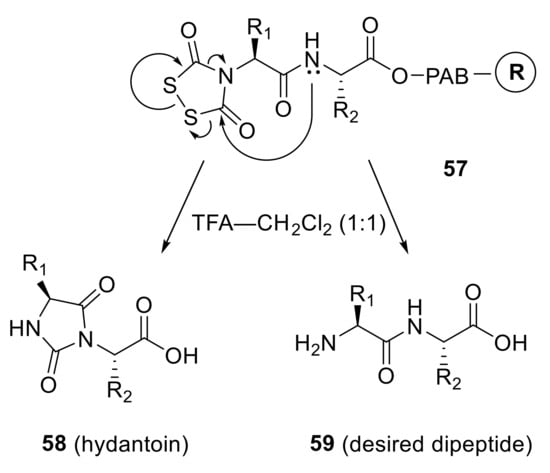 Thus, our 1987 Int. J. Pept. Prot. Res. publication [44] supported an optimistic outlook for stepwise SPPS with Dts-amino acid chemistry, but did include one worrisome hint of a possible “Achilles heel” (Scheme 11). Thus, under exaggerated conditions, we showed that a model resin-bound dipeptide (57) underwent partial conversion to the corresponding hydantoin (58). Results were confirmed after TFA cleavage of the PAB anchor released into solution a mixture of the desired peptide (59) and the modified peptide (58), where the latter component matched an authentic standard made by a literature procedure.