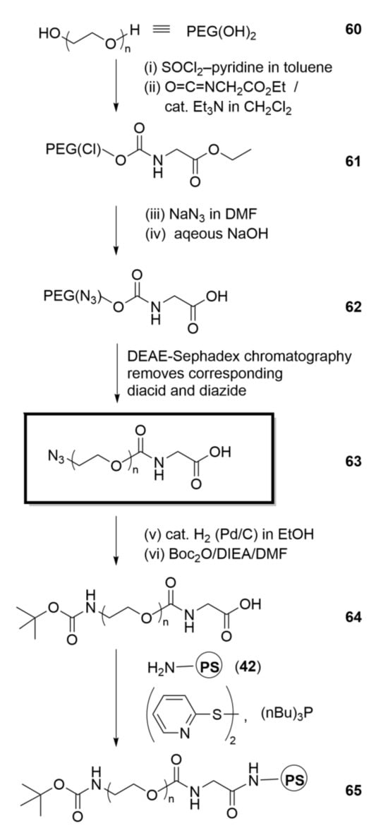 An earlier section of this perspective describes a key control experiment we carried out at a time when we sought a fundamental understanding of the chemistry underpinning our PEG-based “functional purification” routes to Dts-amino acids at the level of purity required for them to be useful for SPPS. Thus, we showed that ion-exchange chromatography of mixtures of PEG derivatives could be used to isolate a specific pure heterobifunctional PEG. Samuel Zalipsky then had the important insight that we harness these discoveries to prepare the pure PEG derivative 64, which is effectively a “big” protected amino acid (Scheme 12). Subsequently, Zalipsky collaborated with Fernando Albericio to couple 64 onto aminomethyl-polystyrene, thereby creating the first PEG–PS graft support (65). With the average molecular weight of PEG and the initial loading of amino groups on PS that were used, this PEG–PS turned out to be equal amounts PEG and PS, on a w/w basis.