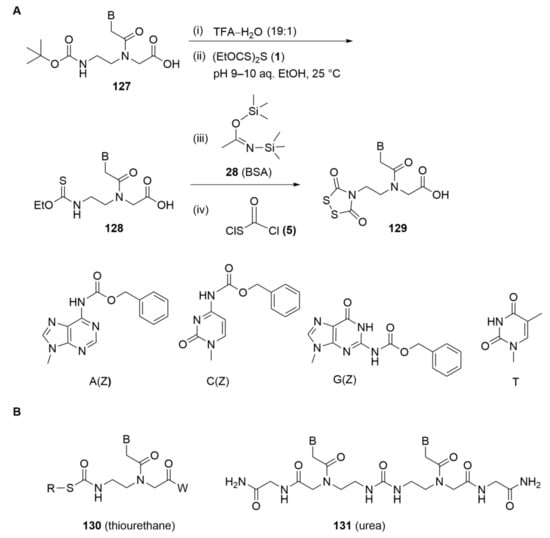 - Dueholm, K.L.; Egholm, M.; Behrens, C.; Christensen, L.; Hansen, H.F.; Vulpius, T.; Petersen, K.H.; Berg, R.H.; Nielsen, P.E.; Buchardt, O. Synthesis of Peptide Nucleic Acid Monomers Containing the Four Natural Nucleobases: Thymine, Cytosine, Adenine, and Guanine and Their Oligomerization. J. Org. Chem. 1994, 59, 5767–5773. [Google Scholar] [CrossRef]