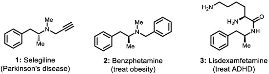 Chiral amines, one category of the most commonly used chiral blocks in organic synthesis, are the crucial structural units of many pharmaceuticals, agrochemicals, fine chemicals, polymers, dyes, pigments, etc. [1]. Within the ample and diverse range of optically pure amines, homobenzylic amine derivatives are much sought-after structural motifs found in a wide variety of market-approved active pharmaceutical ingredients (APIs) and bioactive molecules. The former drug candidates of (R)-selegiline [2,3,4,5,6], benzphetamine [7,8], and lisdexamfetamine (Figure 1) are representative examples of these compounds [9]. (R)-Selegiline, as a pharmaceutical substance belonging to this category, is commonly used in clinical practice to reduce the symptoms of early-stage Parkinson’s disease. The pharmacological effect of (R)-selegiline is that it works as a selective irreversible MAO-B inhibitor slowing the breakdown of certain natural substances in the brain (e.g., dopamine, norepinephrine, and serotonin). (R)-Selegiline is usually used in combination with L-DOPA or carbidopa and can also be used for the treatment of depression and senile dementia [2,3,4,5,6].