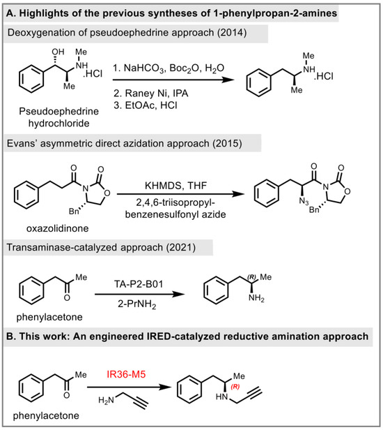 Due to the highly potent biological activities of pharmaceutical substances belonging to this category, considerable efforts have been devoted to their asymmetric synthesis. The synthesis of (R)-selegiline has been reported through different strategies in recent years. Racemic approaches [10,11], chiral pool starting materials, asymmetric hydrogenation, classical/kinetic resolutions [12,13], regioselective aziridine ring openings with organocuprates [14], OsO4-catalyzed asymmetric dihydroxylations [15], and proline based functionalization of aldehydes [16] are the most reported synthetic strategies of (R)-selegiline. In 2014, Pramanik and co-workers reported a deoxygenation of the pseudoephedrine approach to prepare (R)-selegiline (Figure 2A) [17]. In the following year, Sudalai and co-workers employed Evans’ electrophilic azidation of chiral imide enolates as the key chiral-inducing step to synthesize (R)-selegiline in high enantioselectivity (97%, R) (Figure 2A) [18]. In 2021, Lavandera and co-workers employed amine transaminase (ATA) as a biocatalyst to synthesize (R)- and (S)-homobenzylic amines in 81% yield (>99%, R) and 80% yield (>99%, S), respectively [19]. However, it further required an extra 2 steps for alkylation of the primary amine for the synthesis of (R)-selegiline. Herein, we developed an engineered IR36-M5 catalyzed reductive amination approach to access the key intermediate (R)-desmethylselegiline, 1a (Figure 2B).