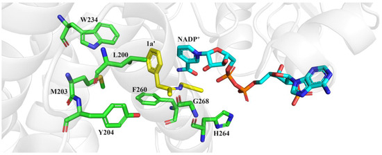 Regarding the position of L200, when we replaced the amino acid with His, Lys, Pro, Arg, Trp, or Tyr, we observed a complete loss of catalytic activity toward the model substrates (Figure S1 and Table S6). This means that most mutations in the L200 amino acid site lead to enzyme inactivation out of the seven amino acid sites. These results indicate that the L200 amino acid site is highly conserved. Conversely, when residue L200 was substituted with Met, Asn, Ile, and Val, we observed R-selectivity with good levels of ee values, reaching 95%, 89%, 86%, and 86%, respectively. This indicates that specific amino acid substitutions at position L200 can lead to improved R-selectivity while maintaining catalytic activity. The results are also consistent with the molecular docking prediction that residue L200 interacts very directly with the phenylacetone 1 moiety (Figure 4). At position 204, we also observed good R-selectivity with ee values reaching up to 94% (Figure S2 and Table S7).